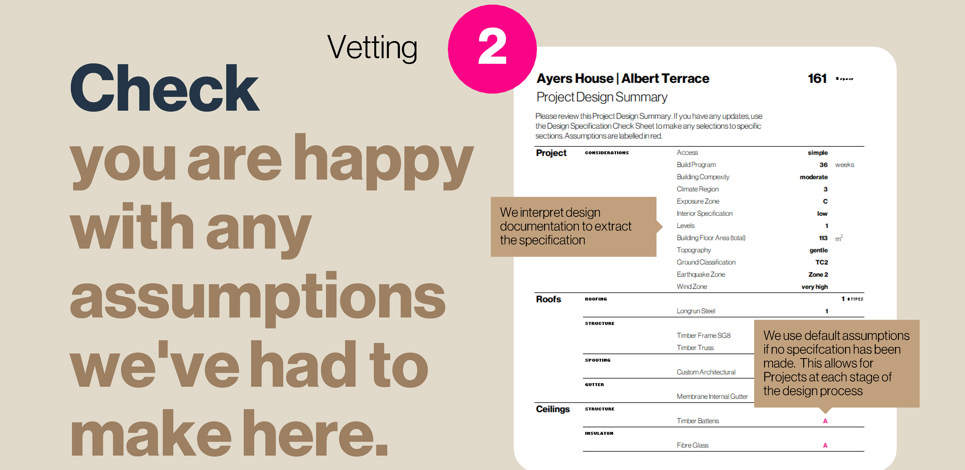 When we vet your Project Documentation we'll capture the scope of the Project. Depending on the Design Phase and any absences in Outline Specification, we may need to make Specification Assumptions. These are shown in the Project Design Summary we return to you before commencing the Project and an opportunity for you to comment or update.